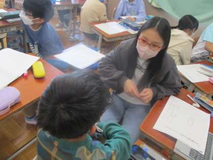 各クラスでテーマを決めて話します。あいずちを打つ、相手に聞き返す、共感するなど今まで学習したことを生かしながら楽しく話しています。