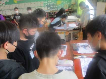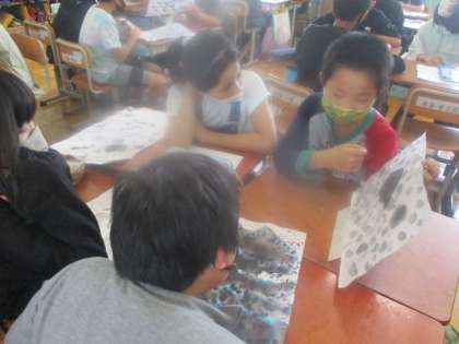 墨で表す絵の鑑賞会をしました。今回は、美術館スタイルで学習を進めました。まずは、自分の絵の説明をグループに行います。