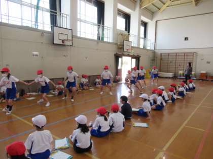 ペア学年やたてわり学年のグループでも交流がある2年生に、丁寧に教える姿も見られました。