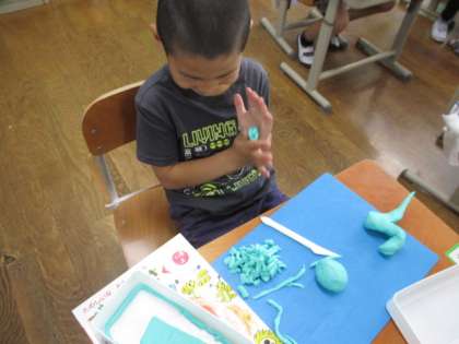 今日は、心臓検診が予定より早く終わったので、みんな大好き粘土を使った図画工作ができました。