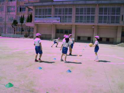 3年生では新しく「エンボール」を行います。ルールを確認した後、次回からの試合に向けてチームでパスの練習をしました。「ボールをとるときは抱きかかえるようにしたらいいよ!」「投げるときはゼッケンが目印になるね!」「もう少し優しいパスの方がとりやすいかな。」と、どうすれば上手くパスができるか、チームで声を掛け合いながら活動ができました。次回からの試合がどのようになるのか楽しみです。