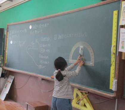 この日は、分度器を使って色々な角度を書きました。180度を超える角度の問題で苦戦していました。最後は、みんなかけるようになりました。