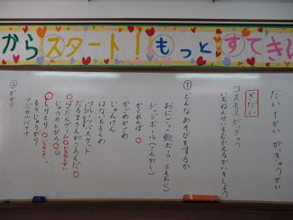 その中で、「1年生が楽しめる遊びがいいと思います」という高学年の意見から、迎える会での遊びを決めることができました。