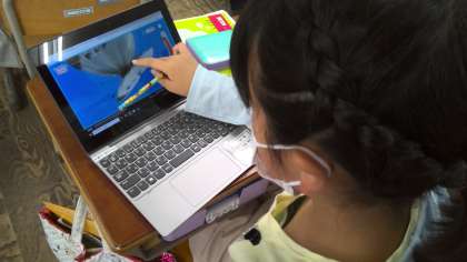 今日の理科はタブレットの図鑑で、チョウの体のつくりを観察しました。