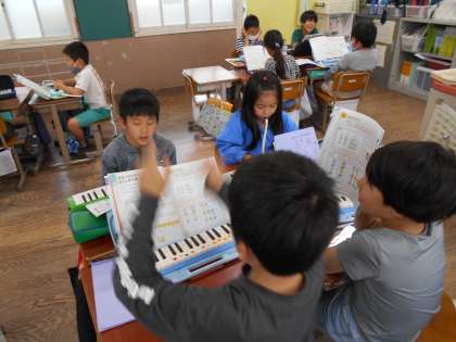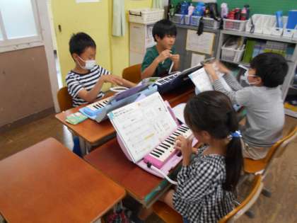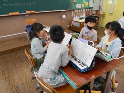 グループで歌、鍵盤ハーモニカ、聴き役に分かれて練習します。