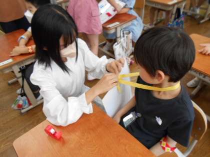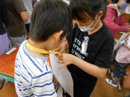 お兄さんお姉さんに首へかけてもらい、大満足の1年生でした。