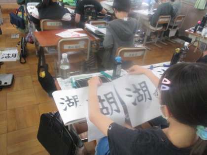 湖は3つの部分を合わせて書く文字です。子どもたちは初めに、半紙のどこにどのように書くかをペアで話しました。そしてまずは試し書きです。