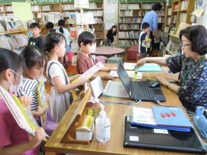 みんな、それぞれ好きな絵本を選んで、図書館司書の先生のところに持っていきます。