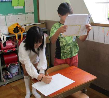 発表の際に使う新聞を作るグループ、台詞を考える、練習をするグループなど各々で考えて活動していました。