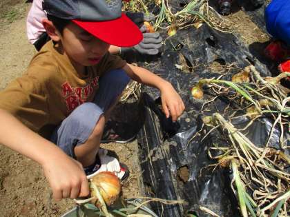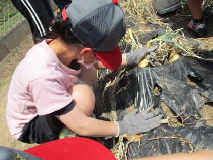 地域の方、保護者のボランティアの方にお世話になって、玉ねぎの収穫を行いました。