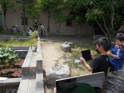 トンボが止まったので、みんなでタブレットで写真におさめようとがんばりました。