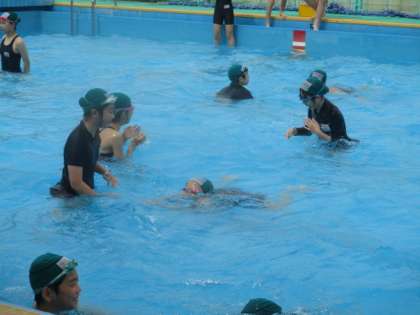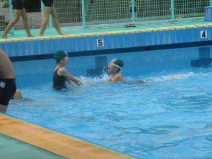 6年生の水泳学習は、バディを組んで教えあっています。