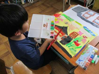 絵具を混ぜ合わせて、自分のイメージに合った色になるように試行錯誤しながら、思い思いの表現を試していました。