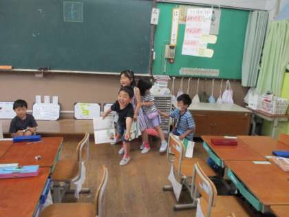 国語科の「おおきなかぶ」の学習では、グループに分かれて音読劇をします。