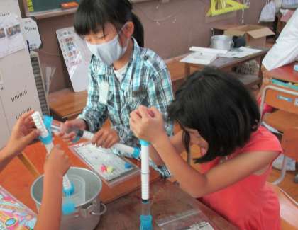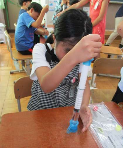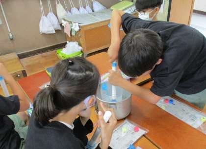今日は自由参観。理科では、空気と水について水鉄砲を使って学習しました。空気や水は体積が変わるのか?について予想して、早速実験。予想が当たっているのか?その現象はどうして起こったのか?と友達と話しながら活動していました。