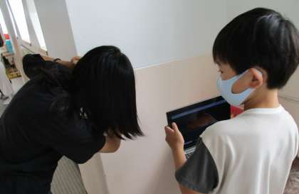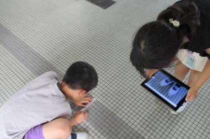 前の日に垂直について学習しました。今日は平行について調べ、特徴を理解しました。教室を眺めてみるとなんと平行がいっぱい!!「窓にあります!」「黒板にあります!」では廊下は?他の階は?と疑問が広がり、タブレットを使って探しに行くことにしました。