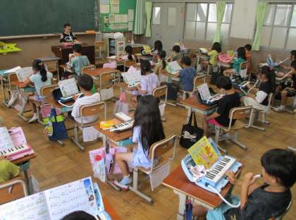 友達の演奏の工夫をまねして、みんなで楽しみました。