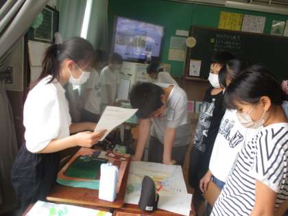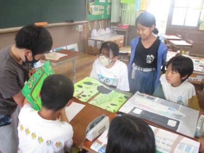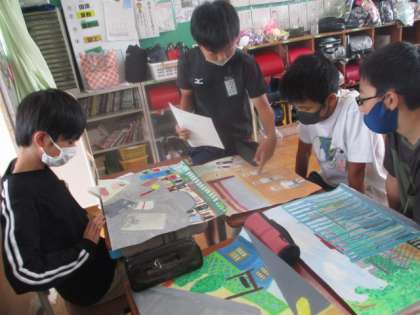 2組の鑑賞の様子です。まずは、グループでお互いの絵を説明したり、質問したりと自分の頑張りや工夫を話しながら鑑賞を行いました。