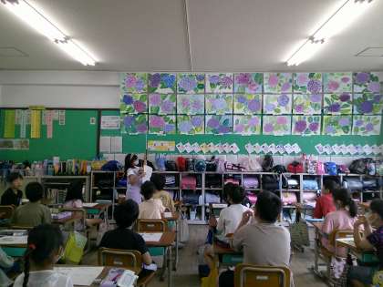 完成したあじさいの絵の鑑賞会をしました。友達の作品のすてきなところを見付けて、紹介しました。友達の作品を鑑賞して、「いいな。」と感じたところを、今後の自分の作品にも生かしていけたらいいなと思います。