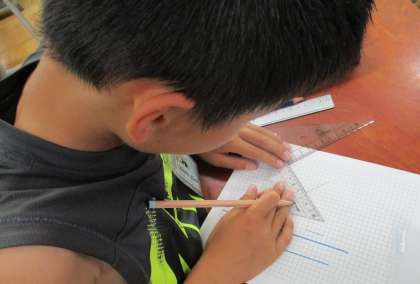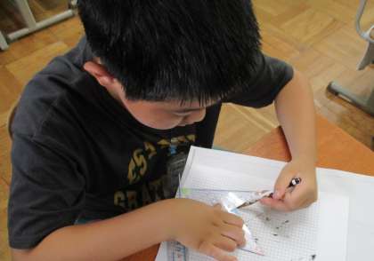 今日は、今まで学習した平行や垂直の書き方を使って方眼紙にいろいろな模様や絵をかきました。三角定規の使い方は完璧!!6校時で疲れているはずなのに、集中してよく頑張りました!