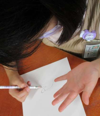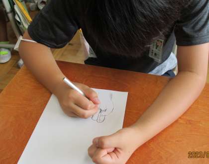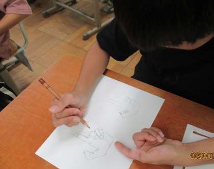 今日の図画工作の準備物は鉛筆のみ。描き方のポイントを確認したら、早速、自分の手をスケッチしました。「こんなに手を描くって楽しんや。」「2回目はもう少し大きく描きたいな。」と。