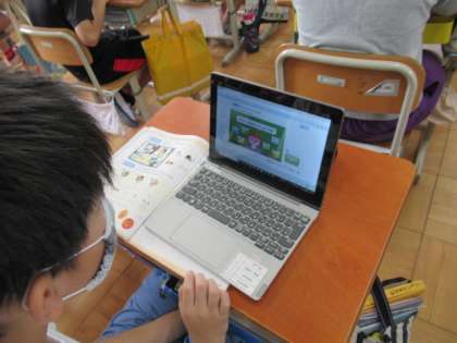 外国語科の学習では、チャンツなどの活動のときにデジタル教科書を用いて、学習しています。