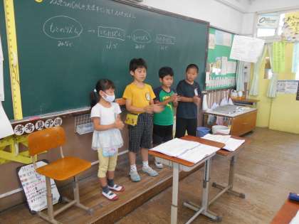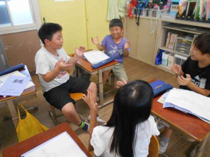 今日は、「元のリズムをみんなでうつ→作ったリズムを一人でうつ」のくりかえしで班ごとに発表しました。