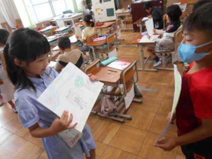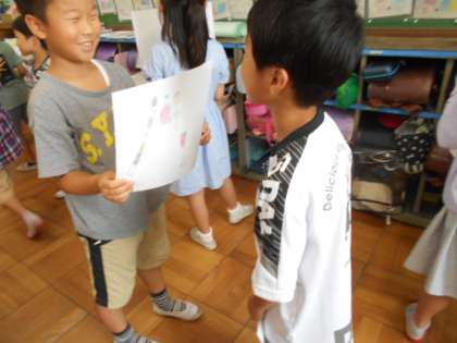 あったらいいなと思うものを画用紙にかき、今日は発表の練習をしました。