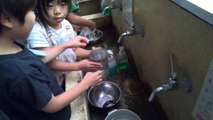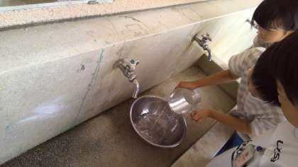 子ども達は、1リットルマスと1デシリットルマスを使って、グループの人と協力しながら、はかっていました。
