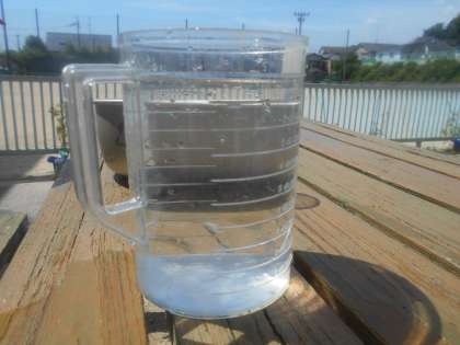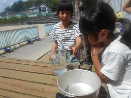 鍋ややかん,ボールなどいろんなものに、「1リットルはこれくらい」という量の水を汲んで1リットルますに注ぎます。あふれちゃう子、ぜんぜん足りない子、いろいろですが2回、3回と繰り返すうちに「ピタリ賞」が出るようになりました。1リットル当ての次は1デシリットル当てをしました。