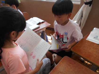 夏だと感じる言葉を見つけて、ノートに書いて、友だちと交流しました。