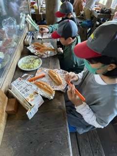 野外炊事『パックドック』作りです。パンに具を詰めて、空気が入らないようにアルミホイルで包みます。おいしくできるかな。