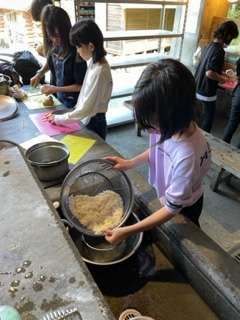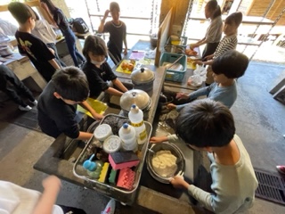 最後の活動の野外炊事が始まりました。野菜を切る人、お米を洗う人、かまどの準備をする人。それぞれの役割に分かれて、おいしいカレーライスを作ります。がんばるぞー。