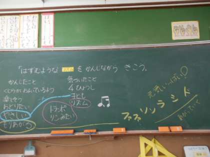 「もりあがっていくよ。」という発言に対して、「最後のところが『ファ・ソ・ラ・シ・ド』と音が高くなるからじゃない?」と別の子。