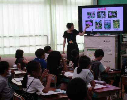 「秋といえば何が思い浮かびますか?」と教育実習生の松尾が聞くと、「運動会です。」「さつまいもです。」と次々と発表していました。