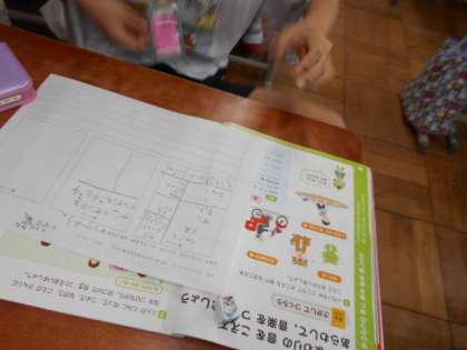教科書には、カエルや犬・バイク・雨の日の様子・掃除機の挿絵が載っています。