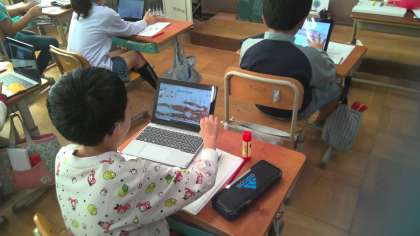 腕の筋肉はどうなっているのか,予想をしたあとタブレットなどを使って調べました。筋肉の動きを調べてみると,筋肉はちぢんだりゆるんだりすることが分かり,驚いている様子でした。「きん肉がちぢむから力こぶができるのか!」と自分の腕を動かしながら確かめる様子も見られました。