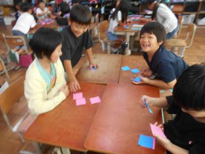 国語科の主語と述語の学習で「主語述語ゲーム}をしました。ピンクの紙に主語、青いカードに述語を書いて、組み合わせて文をつくりました。いろんな文が出来て,楽しく主語と述語を学びました。