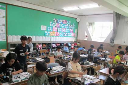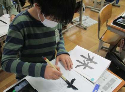 気をつけるポイントをみんなで見つけた後、自分で練習用紙を選び黙々と練習しました。「はらいが気になるな。どうしたらいいかな。」「この林は左右のバランスが前よりも上手くできた。」と自分で課題やよい点をを見つけながら取り組んでいました。