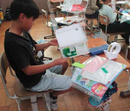 「ころころガーレ」に取り組んでいます。画用紙を切り貼りして、ビー玉が転がる仕組みを工夫して表しています。制作に夢中の子どもたち。友だちの作品からアイディアや刺激をもらって更によい物に仕上げようと真剣です。「その仕組みいいね。」「どうやって作ったん?」いろいろなやり取りがあちらこちらから聞こえてきます。