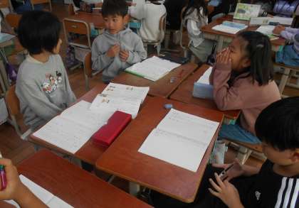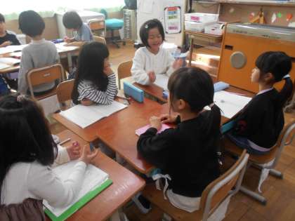 国語科の「そうだんにのってください」の学習で、話し合い活動をしました。相談したいことを班の人に話し、班の人は解決に向けての案を提案します。