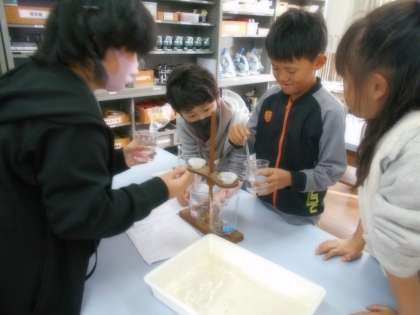 ろうと台・ろうと・初めて見る実験器具に興味津々。