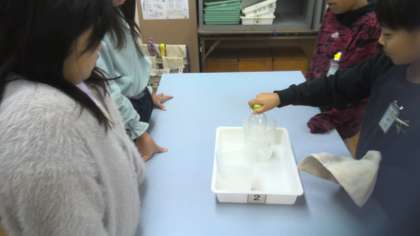 最初の授業では,空のペットボトルをお湯や氷水に入れてようすを観察しました。班で実験をしていく中で「もっとお湯の温度を上げると速くふくらむのかな?!」「もっと長い時間つけておくといいのかも!」などさまざまな考えが出てきました。