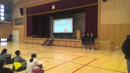 体験授業の後は、樫原小の6年生とともに体育館に集まって、生徒会の先輩から中学校生活について紹介してもらいました。