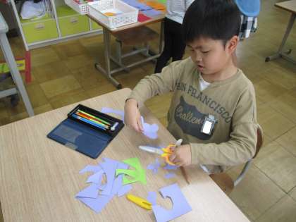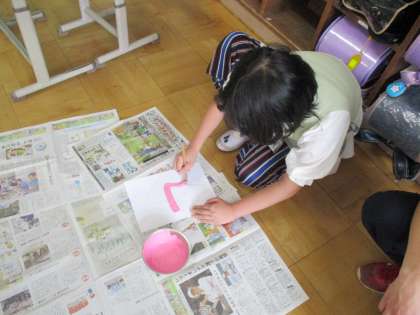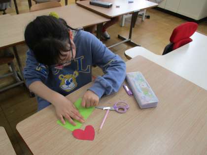 みんなで一文字ずつ担当して、筆で描いたり、画用紙にハートを描いて切って貼ります。