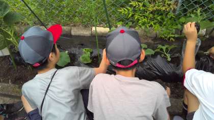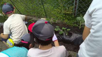 教室で育てていたヒョウタンが大きくなったので畑に植えつけました。グループで役割分担してサッと植付けが完了しました。