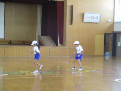 ケンケンパの場、マットの場、ハードルの場、フラフープの場などを通って体育館を一周します。