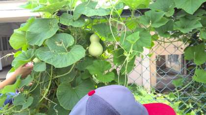 ヒョウタンは実が大きくなり,ずっしりとしていました。子どもたちは触って感触を楽しんだりまだ小さな実を探したりしていました。