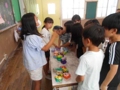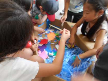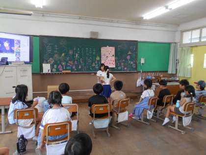 1学期の最終日、教室で「夏まつり」をしました。学級会で話し合って、出し物や係を決め準備してきました。