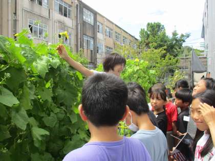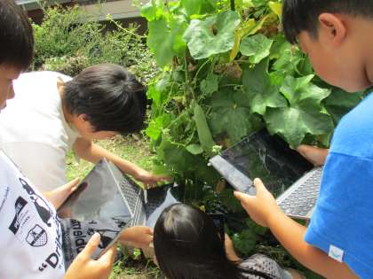 2学期初めての理科です。「雄花には何がついているかな?」「雌花だけについてあるものってあるのかな?」という教師の質問にどんどん反応する子どもたち。実際に見に行って確認することになりました。